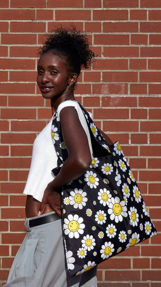 Tote-ally Reversible: Smiley auf einer Tragetasche und einem Rucksack