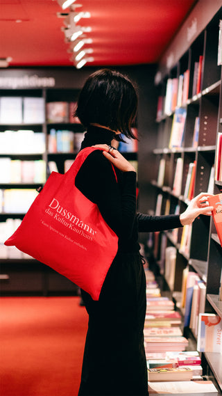 Le plan de Dussmann est de laisser inévitablement la ville entière marquée de leurs sacs rouges, disponibles en trois tailles : S pour votre roman préféré, M pour les disques qui vous font vibrer dans le salon, et L pour les affamés et les festins culturels.